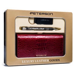 Zestaw prezentowy: duży, skórzany portfel damski, brelok i długopis — Peterson
