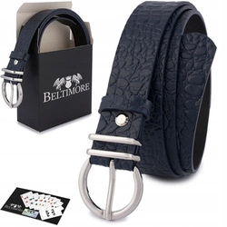 Skórzany pasek damski do spodni sukienki skóra croco granatowy 3 cm Beltimore E56 : Kolory - granatowy, Rozmiar pasków - r.110-125 cm
